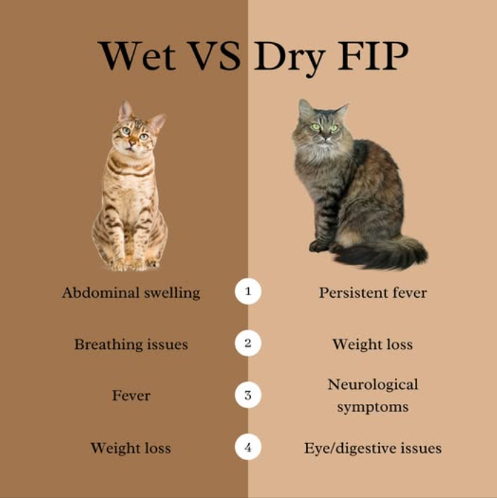 Feline Infectious Peritonitis (FIP) presents with diverse symptoms depending on the form—wet (effusive) or dry (non-effusive)—and the affected organs. Below is a detailed breakdown of typical symptoms, diagnostic clues, and key differentiators: